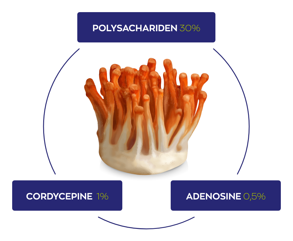 Cordyceps CPA3 is het eerste cordyceps extract op de Nederlandse markt dat gestandaardiseerd is op de drie belangrijkste bestandsdelen. Dit houdt in dat het supplement gegarandeerd 30% polysachariden, 1% cordycepine en 0,5% adenosine bevat.
