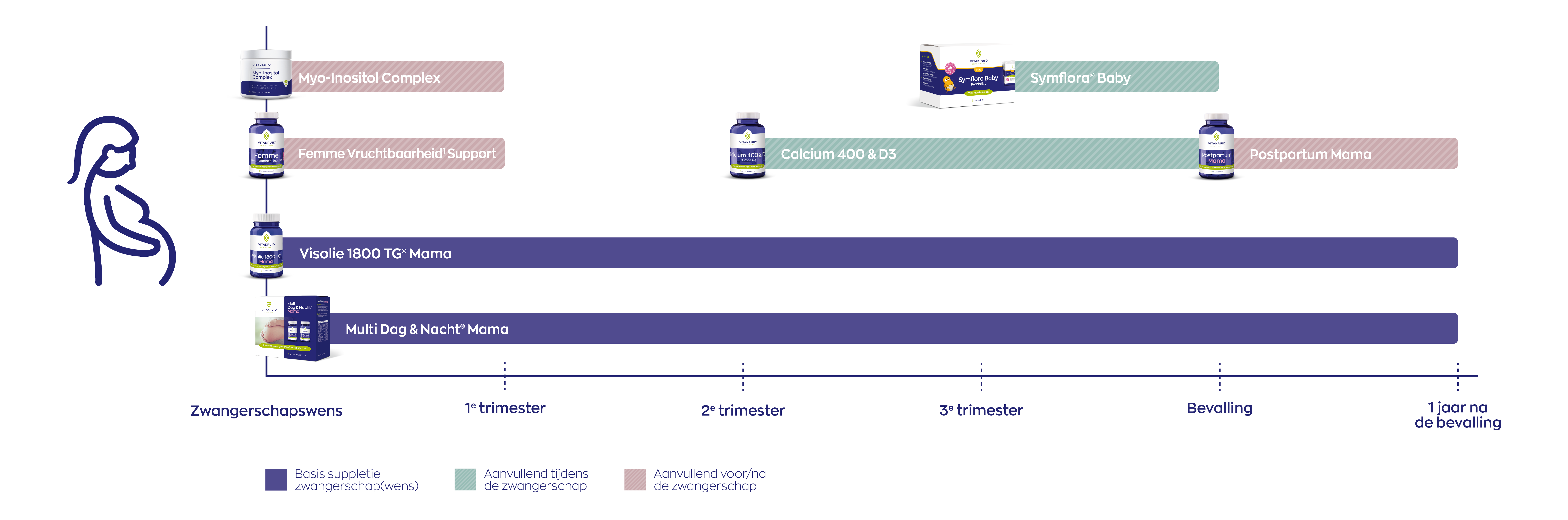 Femme Vruchtbaarheid Support biedt gerichte ondersteuning bij een kinderwens, tot aan de conceptie. Om jouw lichaam voor, tijdens én na de zwangerschap te ondersteunen bestaat ons basisadvies uit Multi Dag & Nacht® Mama en Visolie 1800 TG® Mama. Aanvullend op deze basis suppletie is er extra en gerichte ondersteuning mogelijk voor tijdens en na de zwangerschap, zoals weergegeven in de tijdlijn hieronder.